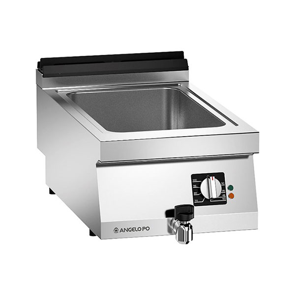 Kuhalo za pečenje u vlažnom obliku sa strukturom od nerđajućeg čelika AISI 304, debljina vrha 20/10 mm. Dobro utisnut u radnu ploču sa satenskom završnom obradom. Korisno za kontejnere GN 1/1 ili višestruke. Indirektno grejanje kontroliše se radnim termostatom 30-90°C i sigurnosnim termostatom. Kontejneri nisu isporučeni. Obezbeđenje za daljinsko isključenje vršne struje.