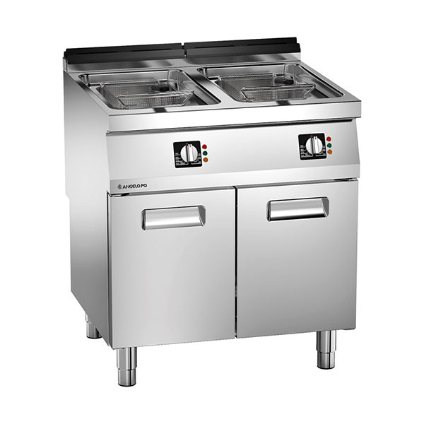 Friteza od nerđajućeg čelika AISI 304, debljina vrha 20/10 mm. Presovani bunari, zapečaćeni na vrhu, velikodušno prekriveni velikom drenažnom zonom; svaki bunar isporučen sa 1 korpom i 1 poklopcem. Mehaničke kontrole. Kontrola temperature preko termostata 100-190°C. Nagibni grejni elementi u bunaru. Predpodešavanje za daljinsko upravljanje vršnom snagom.