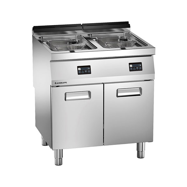 Friteza od nerđajućeg čelika AISI 304, debljina vrha 20/10 mm. Presovani bunari, zapečaćeni na vrhu, velikodušno prekriveni velikom drenažnom zonom; svaki bunar isporučen sa 1 korpom i 1 poklopcem. Digitalne kontrole. Elektronska ploča za kontrolu i prikaz temperature 0-190°C, programiranje funkcije topljenja i zadržavanja 90°C, zvučni alarm na kraju vremena kuvanja. Nagibni grejni elementi u bunaru. Predpodešavanje za daljinsko upravljanje vršnom snagom.