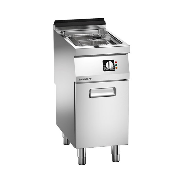 Friteza od nerđajućeg čelika AISI 304, debljina vrha 20/10 mm. Dobro pritisnuto, zapečaćeno na vrhu, velikodušno prekriveno velikom zonom za odvod; svaki bunar isporučen sa 1 korpom i 1 poklopcem. Mehaničke kontrole. Kontrola temperature preko termostata 100-190°C. Nagibni grejni elementi u bunaru. Predpodešavanje za daljinsko upravljanje vršnom snagom.