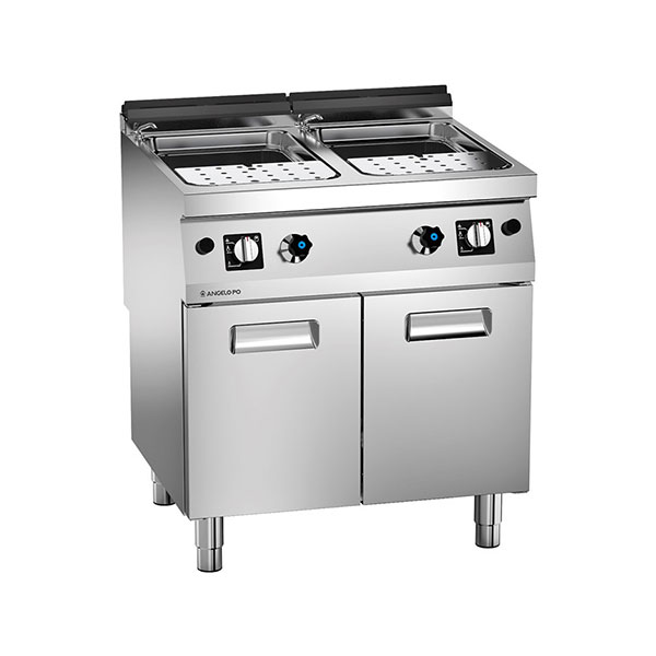 Šporet za testenine od nerđajućeg čelika AISI 304, gornji deo debljine 20/10 mm. Presovani bunari napravljeni od bunara od nerđajućeg čelika AISI 316L, prednji odvodni otvor za prelivanje sa policom od nerđajućeg čelika, korpe nisu uključene. Dobro punjenje kroz dugme na instrument tabli i izliv za doziranje na vrhu. Grejanje gorionicima kontrolisanim sigurnosnim ventilom.