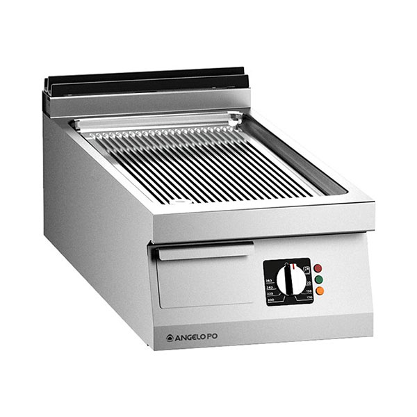 Rešetka od nerđajućeg čelika AISI 304, debljina vrha 20/10 mm. Ploča za kuvanje od čelika Fe510D sa površinskom obradom tvrdog hroma. COOKING-PRO SISTEM. Isporučuje se sa: pločastim utikačem. Grejanje grejnim elementima od nerđajućeg čelika AISI 309, sigurnosni termostat. Radna temperatura (min-mak): 70-260°C. Predpodešavanje za daljinsko upravljanje vršnom snagom.