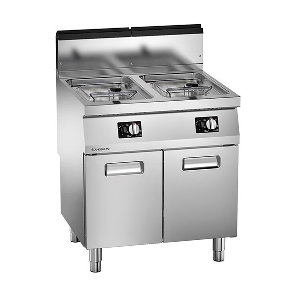 Friteza od nerđajućeg čelika AISI 304, debljina vrha 20/10 mm. Presovani “V” bunari – bez ugrađenog gorionika – zatvoreni u vrh, velikodušno prekriveni velikom drenažnom zonom; svaki bunar isporučen sa 1 korpom i 1 poklopcem. Mehaničke kontrole. Kontrola temperature preko termostata 100-190°C. Cevi za razmenu toplote izvan bunara. Piezoelektrično paljenje pilot lampe, sigurnosni termostat.