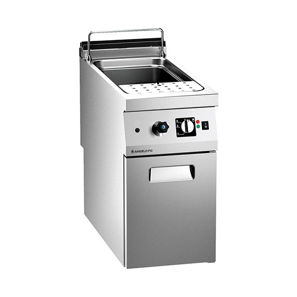Šporet za testenine od nerđajućeg čelika AISI 304, gornji deo debljine 20/10 mm. Presovani bunar napravljen od bunara od nerđajućeg čelika AISI 316L, prednji odvodni otvor za prelivanje sa policom od nerđajućeg čelika, korpe nisu uključene. Slavina za punjenje vode postavljena na vrhu, ručna kontrola punjenja bunarske vode. Grejanje gorionicima kontrolisanim sigurnosnim ventilom.