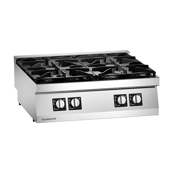 Gasni opseg ključanja gorionika od nerđajućeg čelika AISI 304, debljina vrha 20/10 mm. Gornje rešetke i gorionici od emajliranog livenog gvožđa. Uklonjivi gorionici kontrolisani ventilom sa poklopcem gorionika sa dvostrukom krunom. Pilot svetlo i termoelement. Presovano i zapečaćeno udubljenje gorionika.